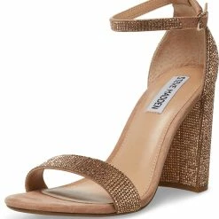 Add an iconic sandal, and some spark to your closet with the versatile Carrson heel by Steve Madden. This shoe is made with rhinestone covered textile, with synthetic lining. The outsoles are made of durable man-made material with trend grooves. This classic inspired heel has lightly padded footbed for all day wearing comfort. This shoe has a 4-inch-tall block heel and adjustable buckle closure on the ankle strap to make them great to go from day to night. As one of the most iconic brands in the footwear industry, Steve Madden offers on trend designs for all aspects of life.
