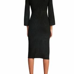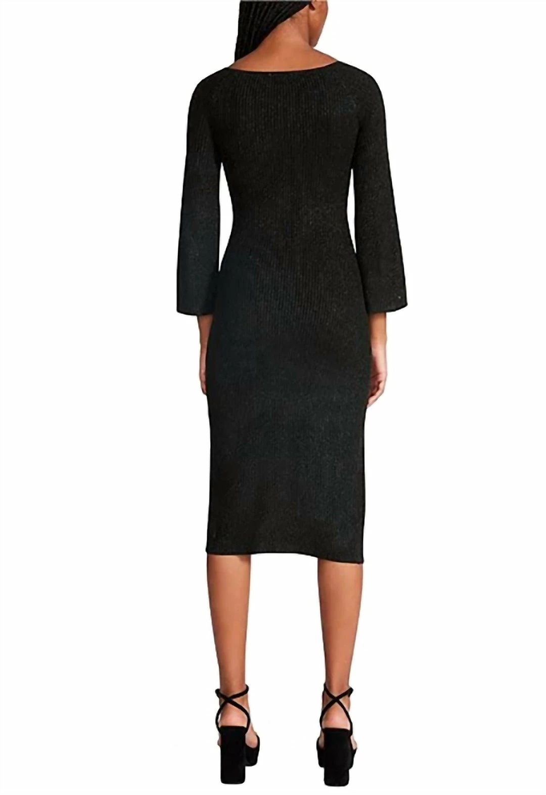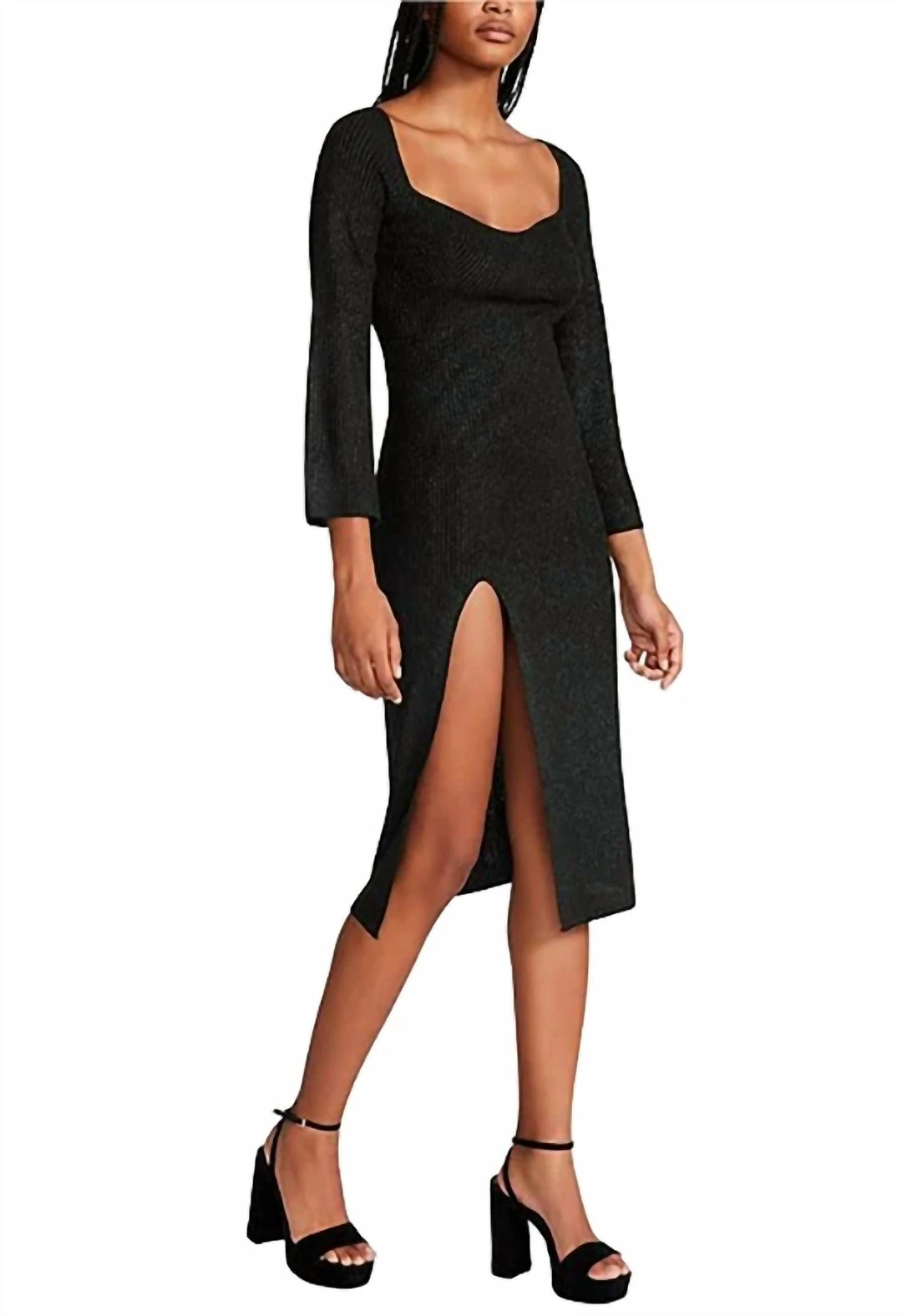 Features a sweetheart neckline, 3/4 length sleeves, fitted silhouette with thigh high front slit and ribbed Lurex fabrication. This pull-on knit dress is unlined.