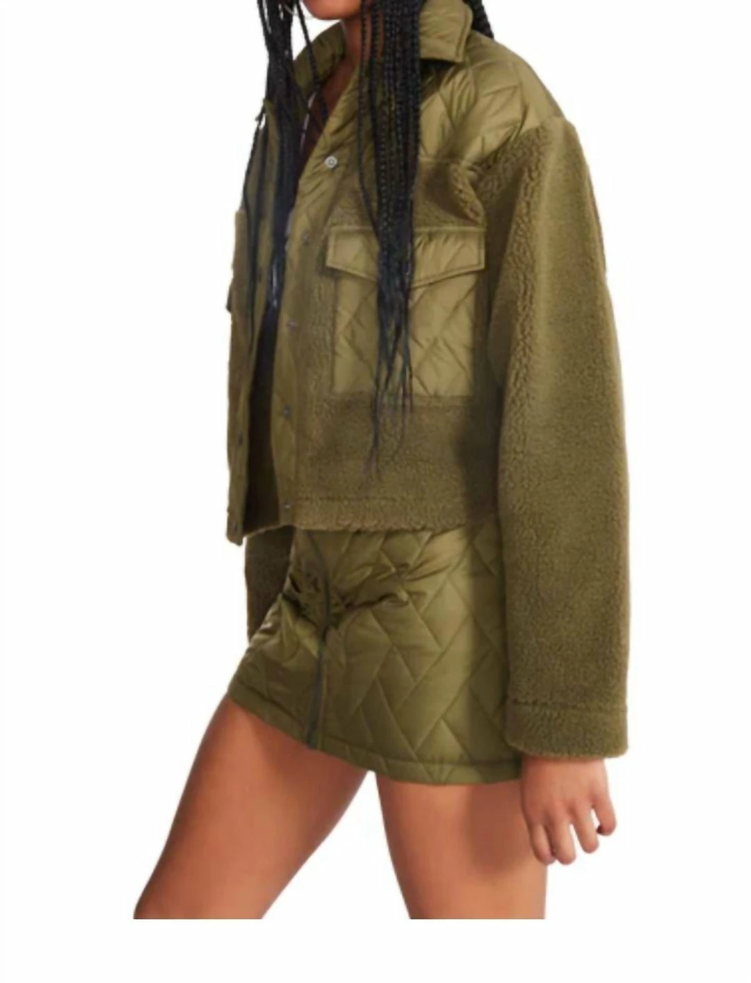 Cropped jacketSnap button closure at front2 patch pockets at front and 1 zipper card pocket at sleeveCollared neckBasket weave pattern quilting on shoulders and pocketsDrop shoulderSherpa fabric sleeves and torsoHand washKristin is 5ft 11in and is wearing a size smallImported๏ฟฝ๏ฟฝ