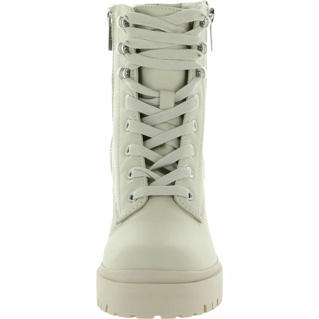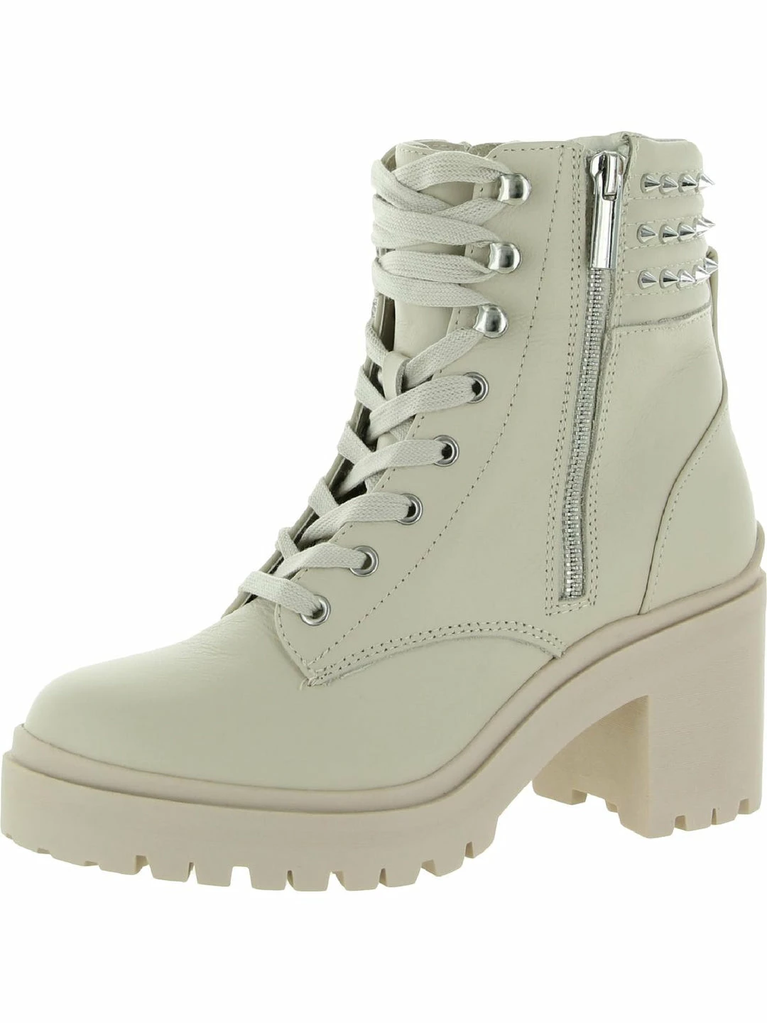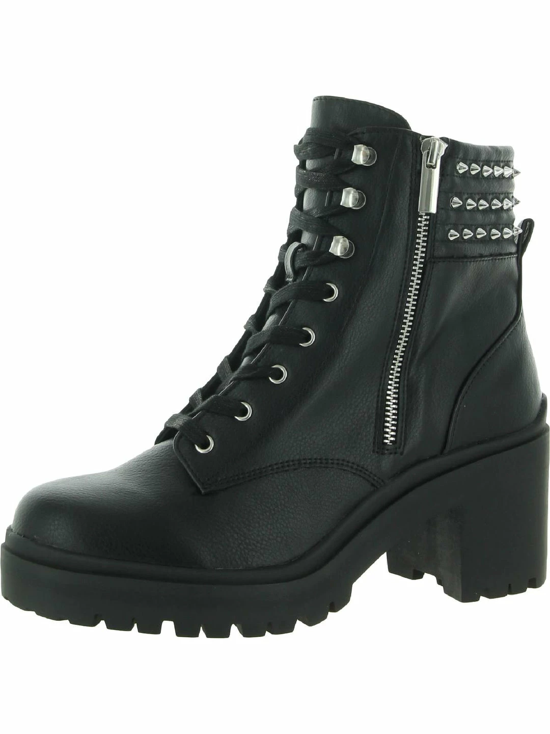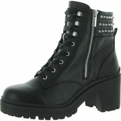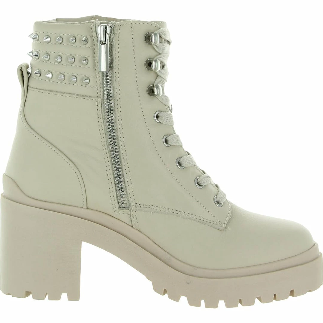 Add a little edge to your look in the Jaydin leather studded combat boots by Steve Madden. Leather uppers with side zip construction. Features a block heel and bold studded detailing. Padded footbed with synthetic outsoles.