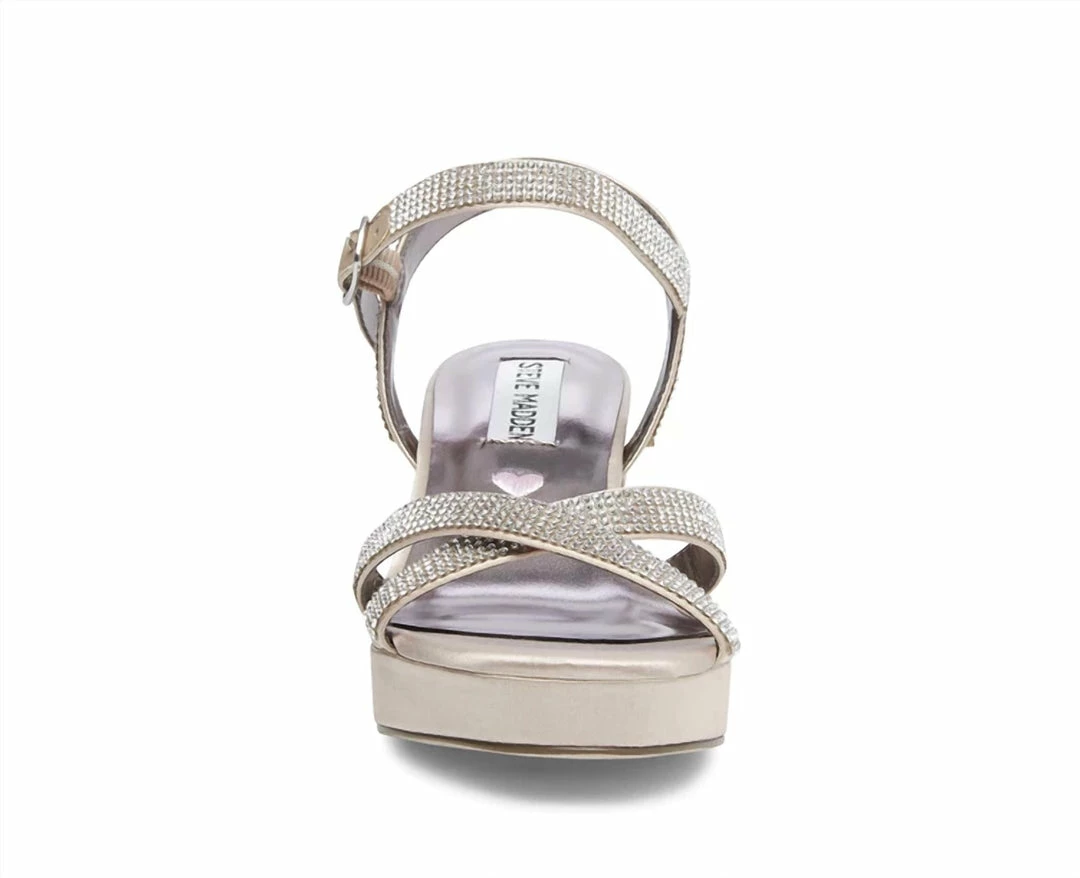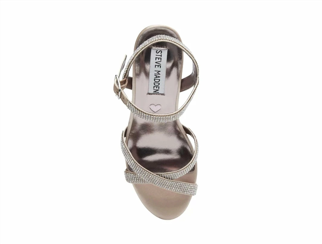 A girls’ dressy heel shoe for any special occasion!HeelChunky heelAnkle strapRhinestones across straps3in heel height