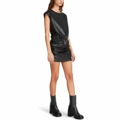 Stay chic in the Muscle vegan leather mini dress by Steve Madden. Made with polyurethane, polyester, and elastane. Buttery vegan leather and a ruched drop waist offer statement making style. It features cap sleeves and a leg baring mini length. Pair it with your favorite boots or heels for that upcoming night out. Shoulder pads for comfort. Back button closure. This dress is guaranteed authentic.