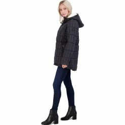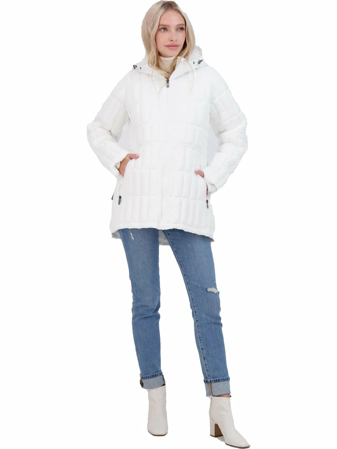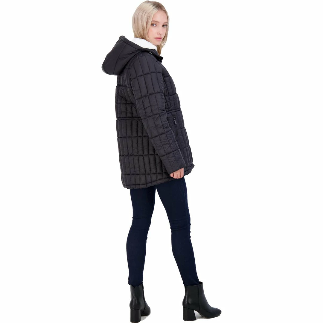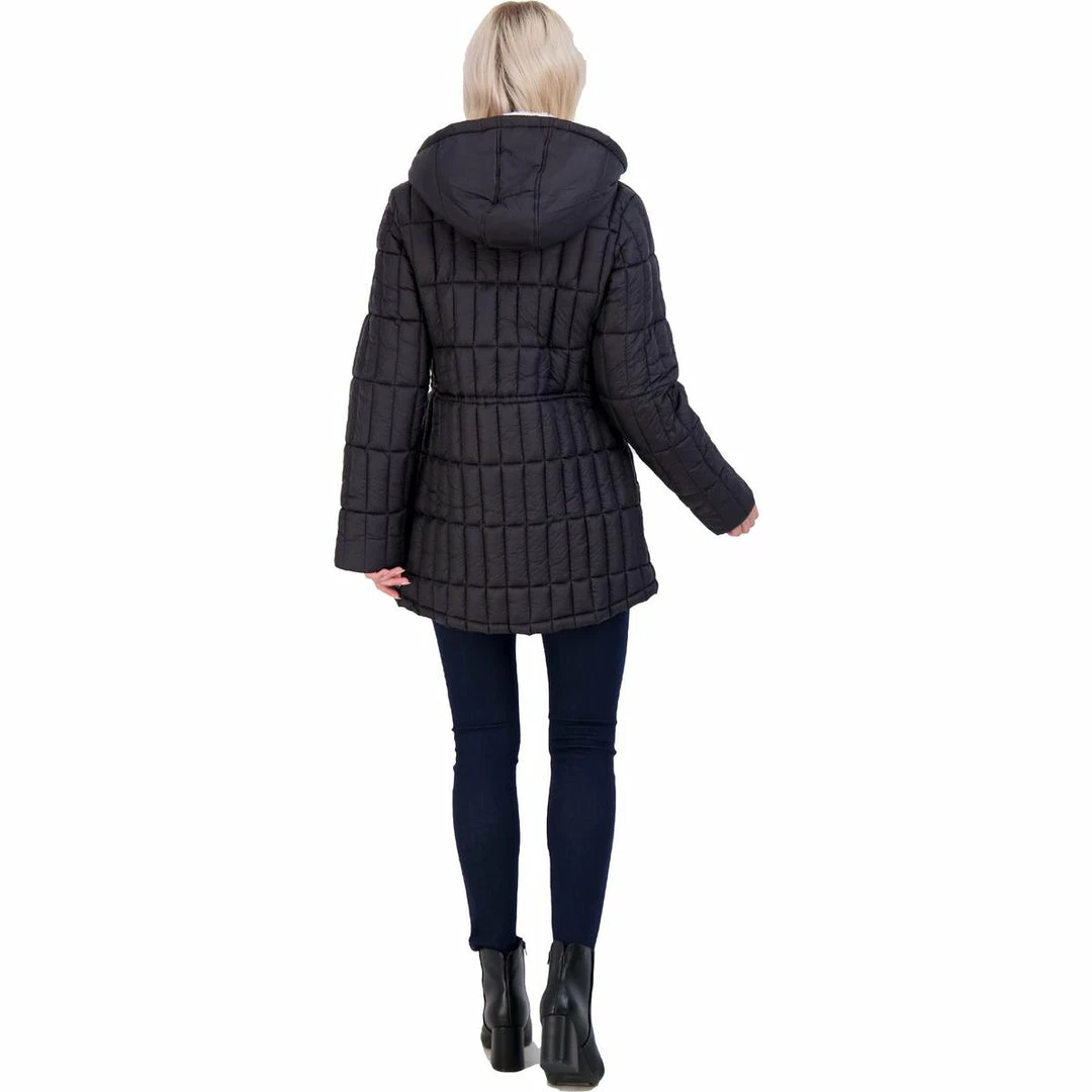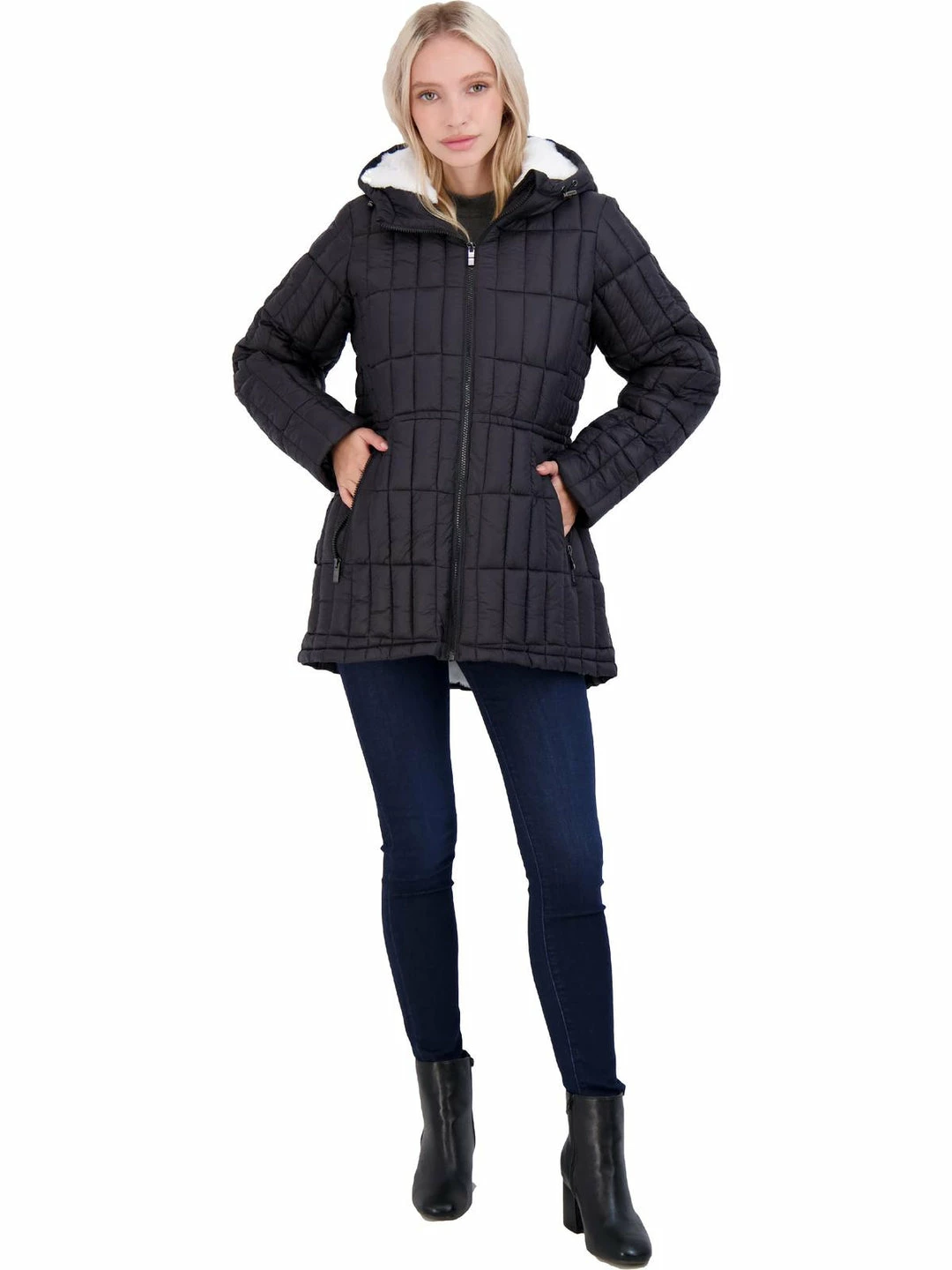 Don’t sacrifice style or warmth in the square quilted glacier shield jacket by Steve Madden. Made with 100% polyester. The square details and mid-length design offer chic, cold weather style while packing in the heat. It features two front zipper pockets and an attached hood. It’s lightweight construction makes it ideal for packing or stowing away. It’s roomy design allows room for multiple layers on bitter days. Zipper closure. This jacket is guaranteed authentic.