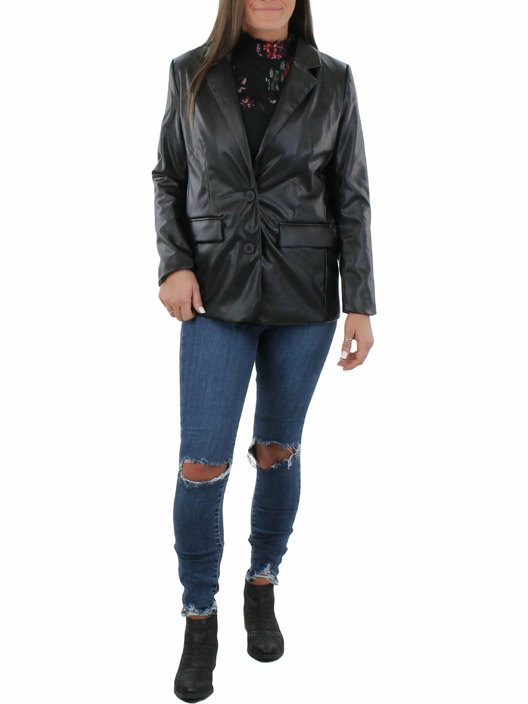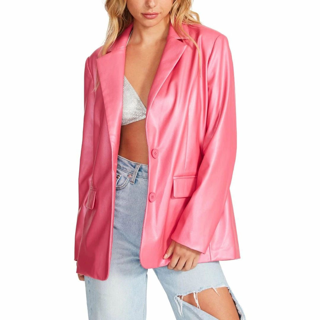 Feel effortlessly chic in this faux leather two button blazer by Steve Madden. Made with 100% polyurethane. This shimmery jacket will be the perfect topper for long days in the office or a night out. It features two front pockets and a notch collar. Layer it up with all your favorite outfits. Button closures. This blazer is guaranteed authentic.